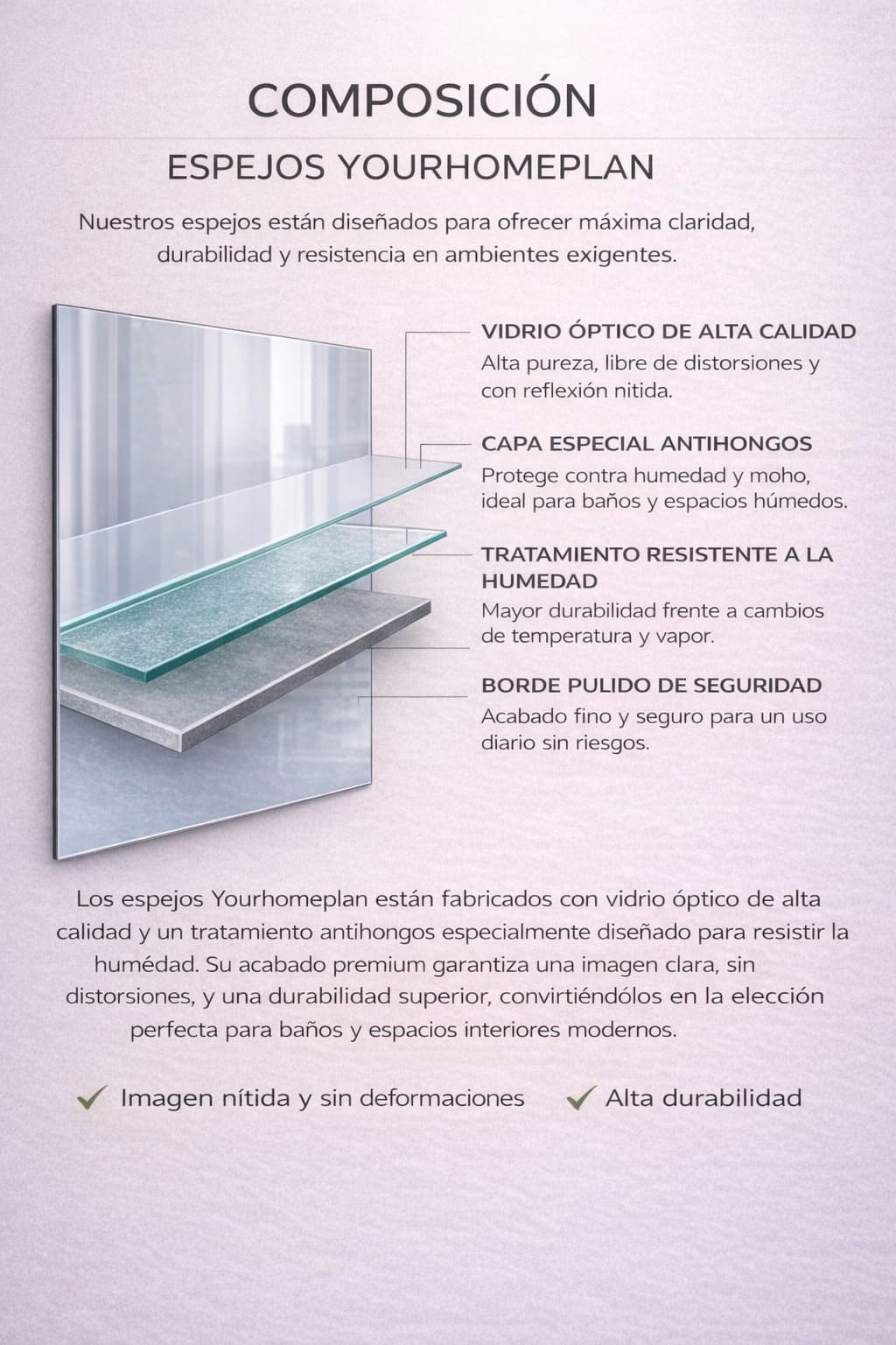 Gracias a su cuidada composición, nuestros espejos ofrecen una larga vida útil, incorporando componentes libres de plomo y una gruesa capa de pintura protectora